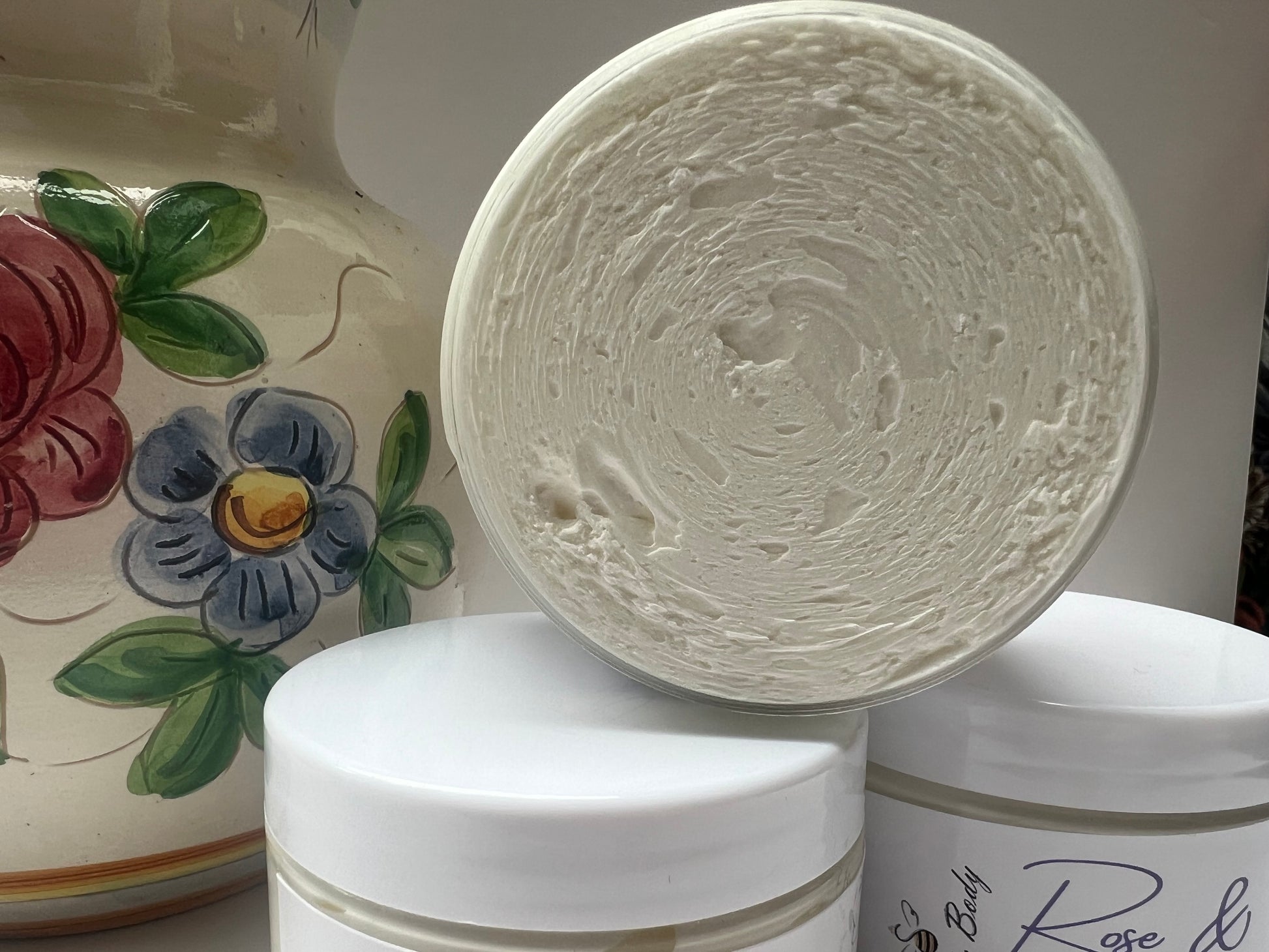 A handcrafted whipped body butter made with shea butter, cocoa butter, and coconut oil. This blend has a soft, airy texture that spreads easily onto the skin.